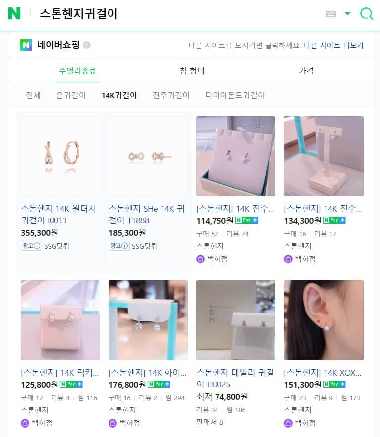미니골드도 14k 귀걸이, 목걸이로 검색할 경우 10~20만 원대의 모델들을 찾아볼 수 있으며 스톤헨지보다는 조금 저렴한 편입니다.