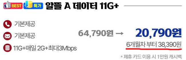 [LTE 데이터 11G 제공 / 일 2G 제공 / 소진 시 3 Mbps / 문자, 전화 무제한]