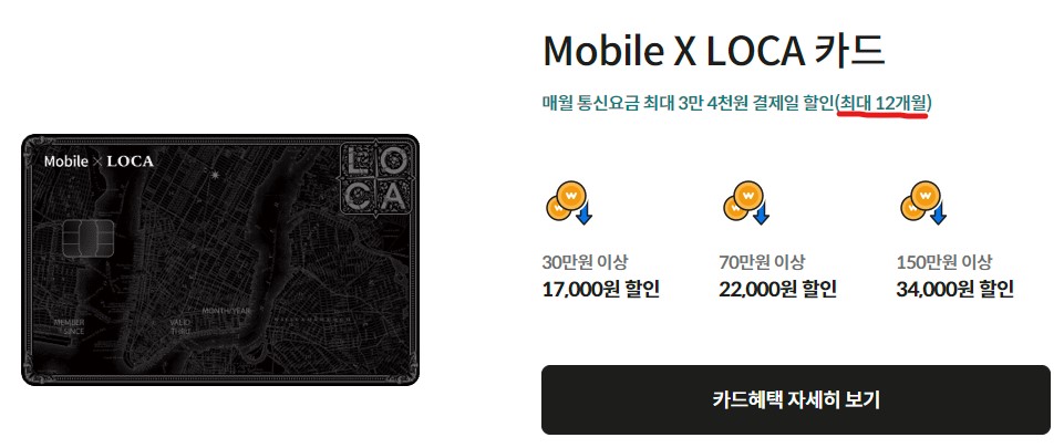 ※ 주의 사항 : 카드별로 할인을 받을 수 있는 기간이 12개월, 24개월 등 상이합니다.