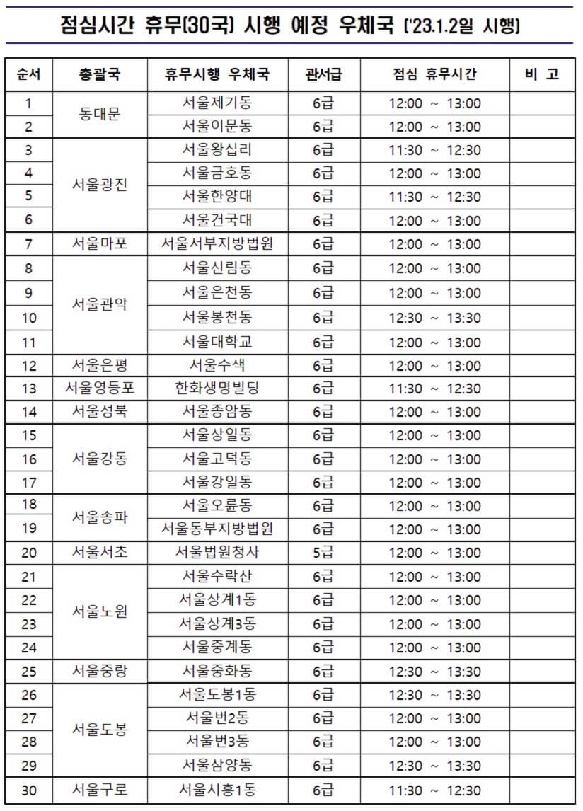2022년 12월 현재 서울지방우정청 홈페이지에 나와있는 점심시간 휴무제를 시행하고 있는 우체국입니다.