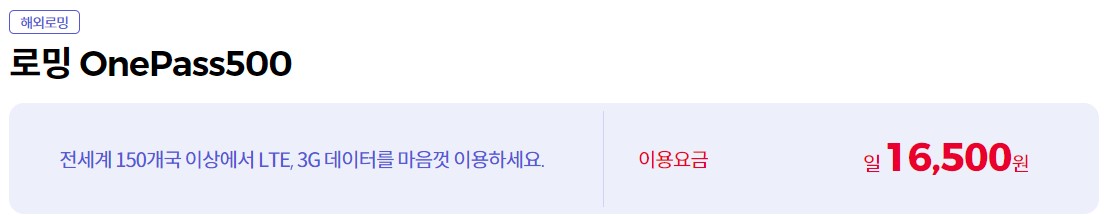 1일 이용요금 16,500원에 전 세계 150개국 이상에서 해외 로밍 데이터를 무제한으로 사용할 수 있는 서비스입니다.