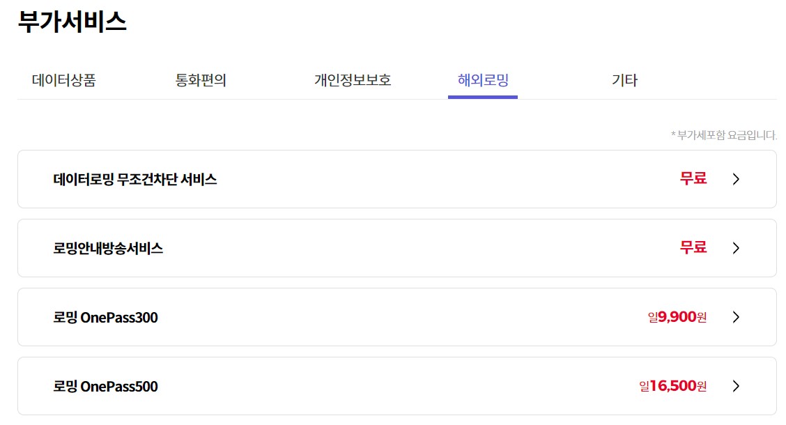 로밍 OnePass300, 로밍 OnePass500과 함께 부가적으로 로밍 안내 방송 서비스가 다 입니다.